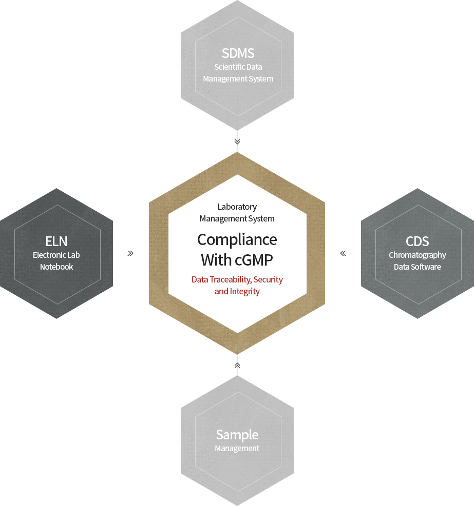 모든 크로마토그래프 (HPLC, UPLC, GC) 기기는 CDS를 이용하여 네트워크 기반에서 운영되며, 전자실험실노트 (ELN)와통합 데이터 관리시스템 (SDMS)으로 구성된 실험실 정보관리 시스템 (Lab Management System)을 이용하여시험성적서(Certificate of Analysis) 생성을 포함한 모든 분석 데이터를 통합 관리합니다.
