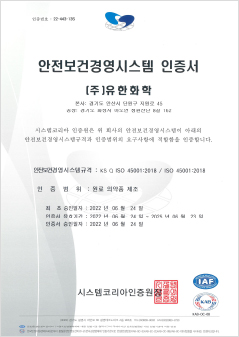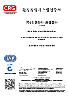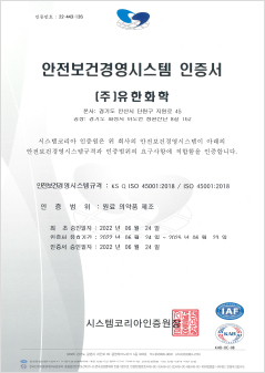 유한화학은 안전·보건·환경 경영방침에 따라 사회적 책임을 다하기 위하여 전 사업장에 ISO 14001, ISO 45001 인증을 취득, 운영하고 있습니다. 더욱 안전하고 쾌적한 사업장을 만들기위해 지속적으로 개선하고 있습니다.