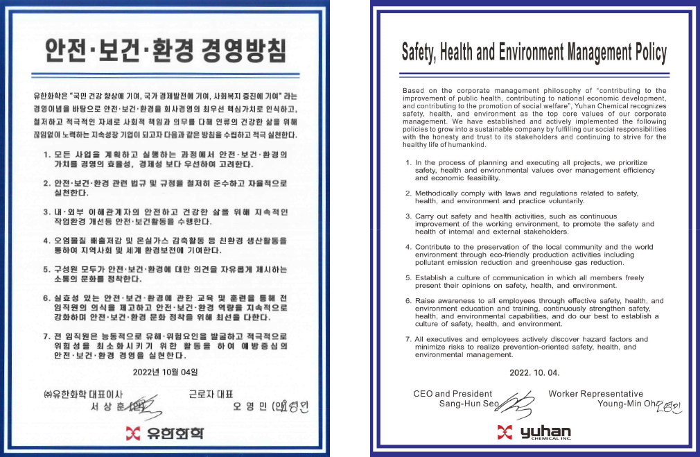 유한화학은 안전과 환경을 최우선으로 생각합니다. 인간존중 및 친환경 경영을 통한 건강한 인류, 깨끗한 환경 조성을 목표로 안전환경보건 경영을 추구하고 있습니다.